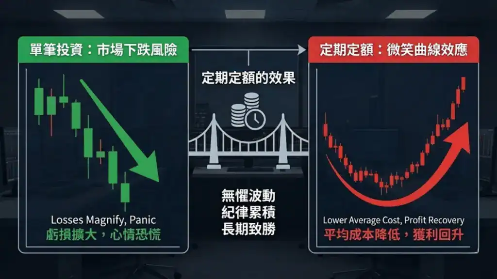 • 關鍵動作:當帳面虧損達 -10% 時,不要停扣,反而應啟動 定期定額 vs 單筆投入 的邏輯進行加碼,這是累積單位數的最佳時機。