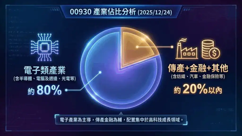由於台灣的高科技電子業(如半導體、電腦週邊)通常也是獲利能力較好、且積極進行低碳轉型的族群,導致 00930 的成分股中,電子類股佔比較高。