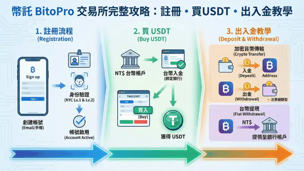 實際走一遍「註冊 BitoPro ➡️ 銀行綁定 ➡️ 入金 ➡️ 買入第一筆 USDT」的流程。
