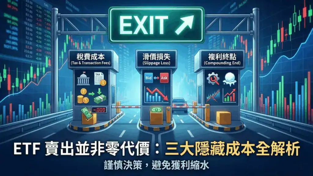 ETF賣出三大隱藏成本示意圖 ▋ 快速總結: ETF 在股市開盤期間可隨時賣出變現。然而除價差損益外,投資人還需支付 0.1% 證交稅與券商手續費,並可能面臨因流動性不足產生的滑價損失,以及中斷複利滾動的機會成本,頻繁進出將大幅削弱長期獲利。